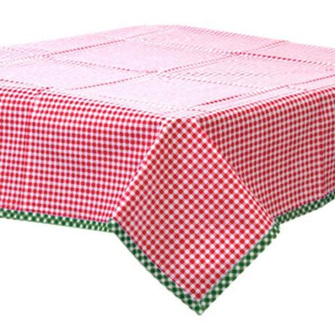 These square and rectangular tablecloths are finished with blue, lime green, green, navy blue, or black gingham trim.