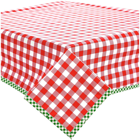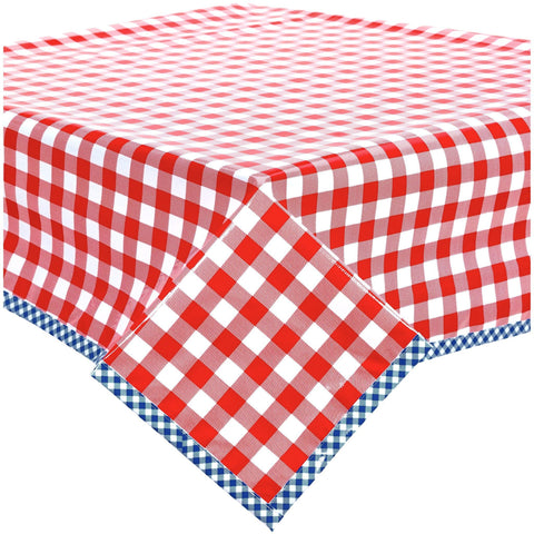 These square and rectangular tablecloths are finished with blue, black, lime green, green, or navy blue gingham trim.