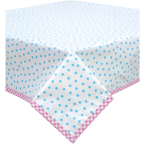 square dot light blue oilcloth tablecloth with lime green gingham trim
